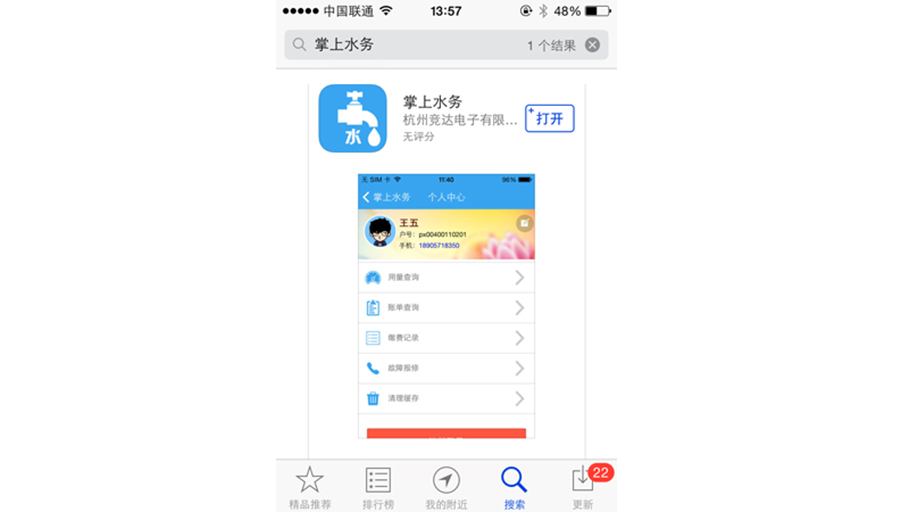 第一步:打開應用商城,搜索“掌上水務”,下載“掌上水務”APP